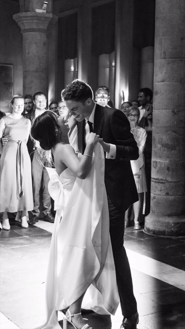 The couple shared that their favourite part of their Belgian wedding was their ceremony, which took place in an intimate courtyard garden nestled within a monastery, beneath the leafy boughs of a grand tree, with a picturesque Antwerp cathedral serving as the backdrop.